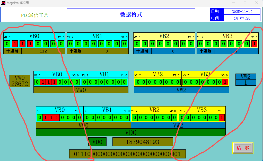當我給VD32賦2#數(不管是什么數,還是16#數)時,VB32、VB33、VB34、VB35為什么始終為0