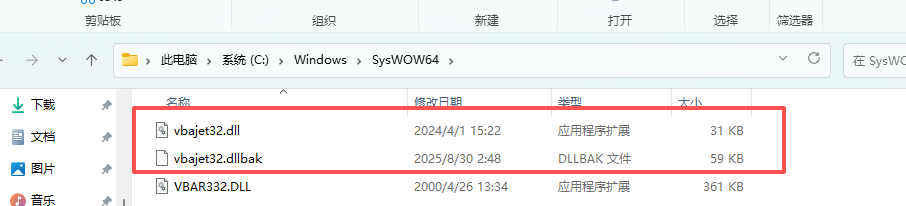 C:\Windows\SysWOW64\vbajet32.dll拒絕訪問,接著百度搜了一下,發(fā)現(xiàn)是win11系統(tǒng)更新時把這個dll文件更新了,于是我想著替換掉這個文件回老版本行不行呢,于是就試了一下,結果發(fā)現(xiàn)是可以的。