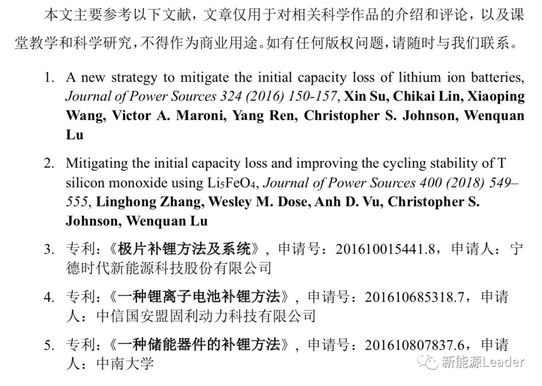 在Wenquan Lu推出Li5FeO4材料實(shí)現(xiàn)正極補(bǔ)鋰后,國(guó)內(nèi)廠家和研究機(jī)構(gòu)也對(duì)正極補(bǔ)鋰技術(shù)進(jìn)行了迅速的跟進(jìn),并申請(qǐng)了大量的專利,例如安普瑞斯(無錫)、深圳比克等公司在2017年都申請(qǐng)了通過向正極中添加少量含Li的氧化物等材料,在首次充電過程中這些化合物能夠脫出Li+,補(bǔ)充負(fù)極在首次嵌Li和SEI膜形成過程中所消耗的Li,從而提升首次效率和電池比能量。